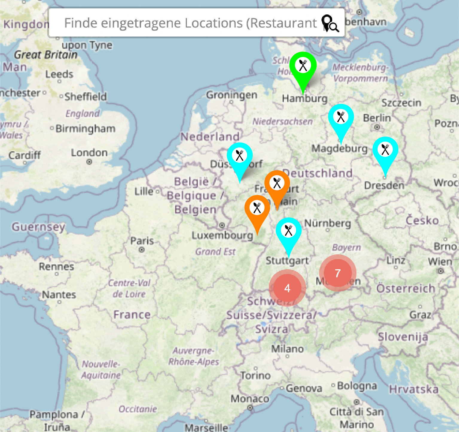 Ja, du kannst mehrere Marker setzen oder Marker für eine bestimmte Location und zusätzlich einen Umkreis im System auswählen. Diese Marker sind dann in Orange gekennzeichnet, da sie flexibler sind.